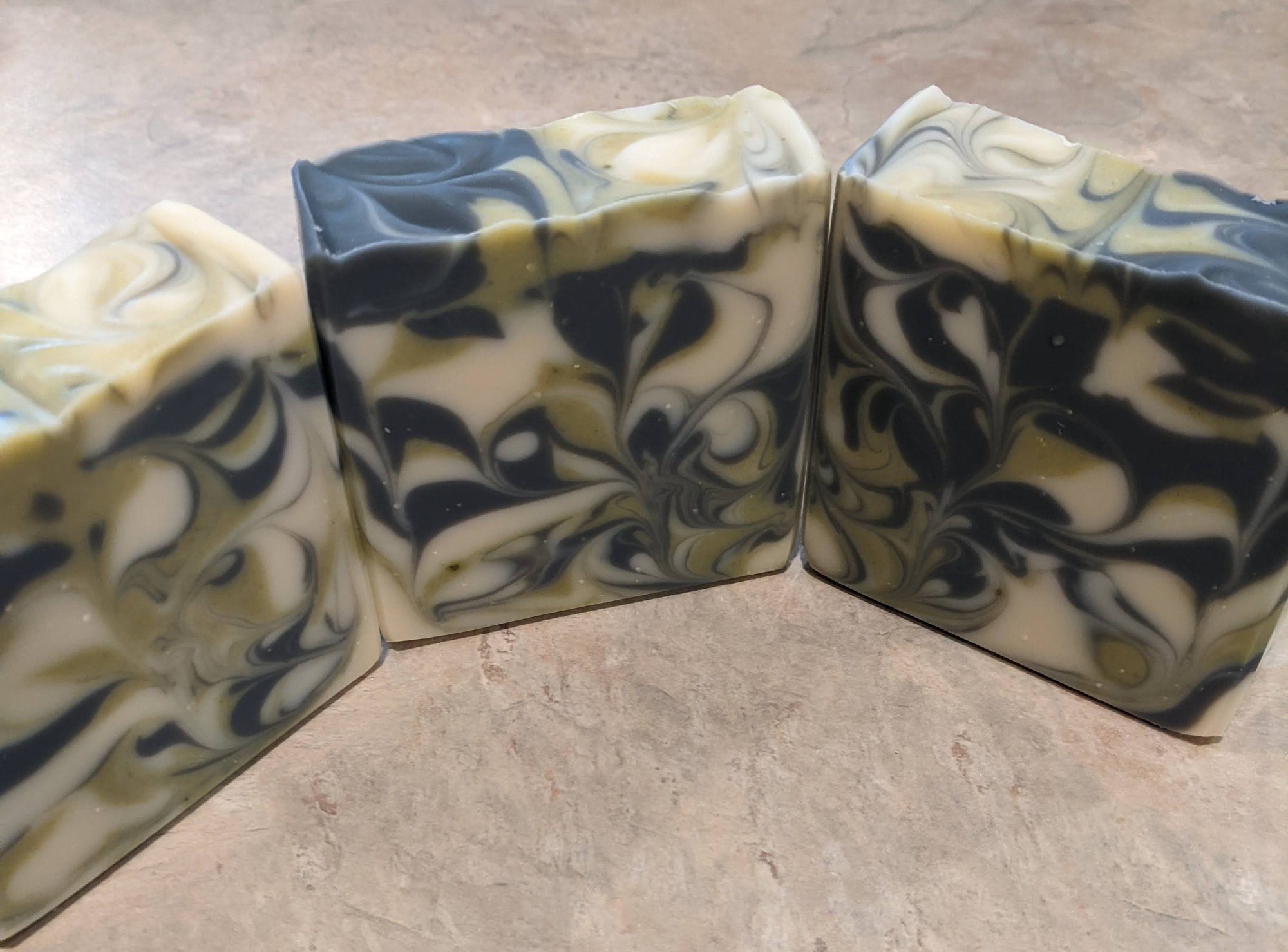 Ingredients: Olive oil, Filtered water, Coconut oil, Lye, Castor oil, Spinach Powder, Activated charcoal, Patchouli essential oil, and Lime essential oil.